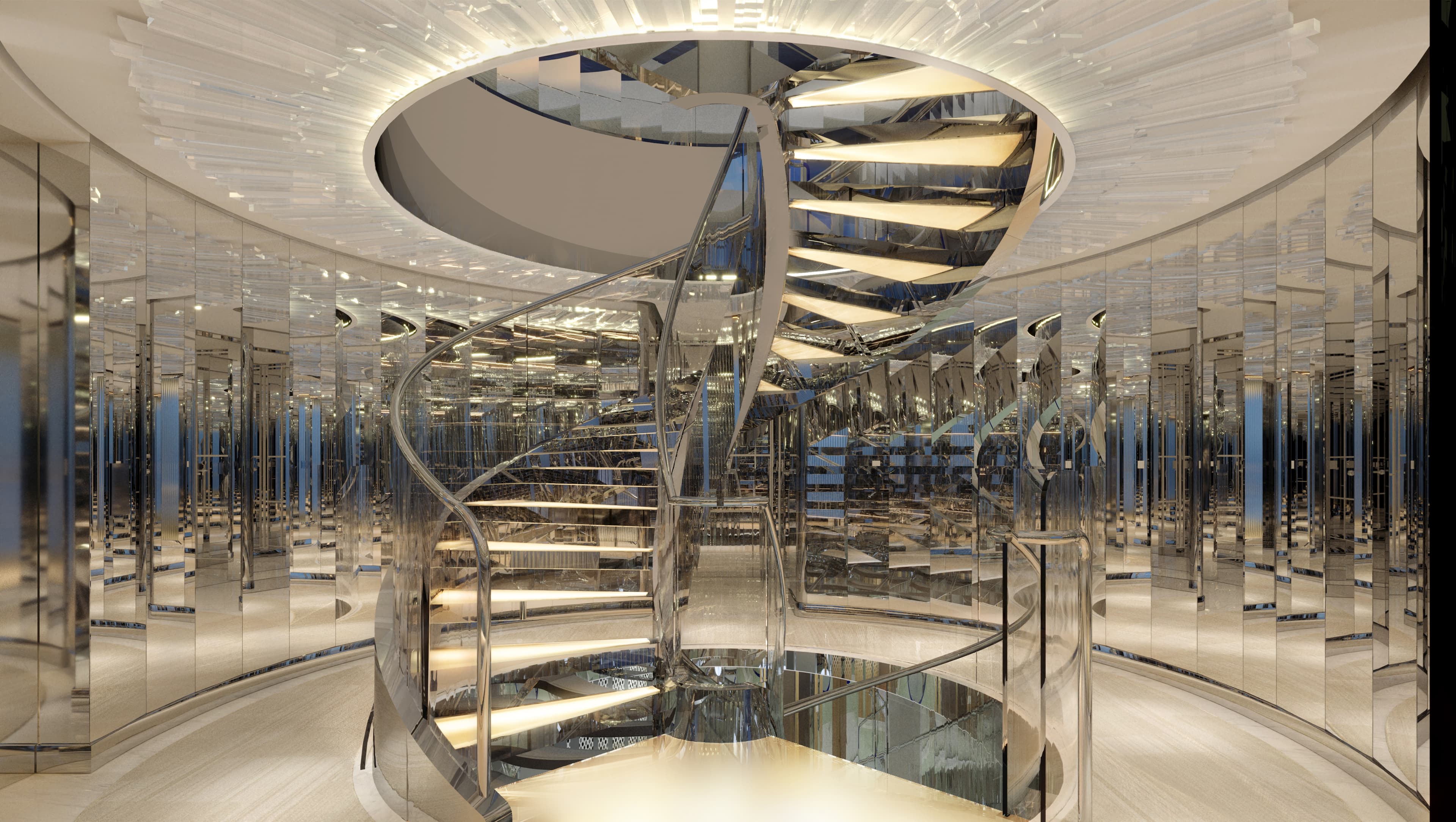 Housed within the vessel’s glass-enclosed funnel, our largest, most exclusive suite offers three bedrooms across four levels of living space with unimpeded sea views from panoramic, floor-to-ceiling windows. Enjoy a sunset dip in your private splash pool, limber up in your outdoor gym, and enjoy unforgettable meals indoors or on your sprawling private terrace.