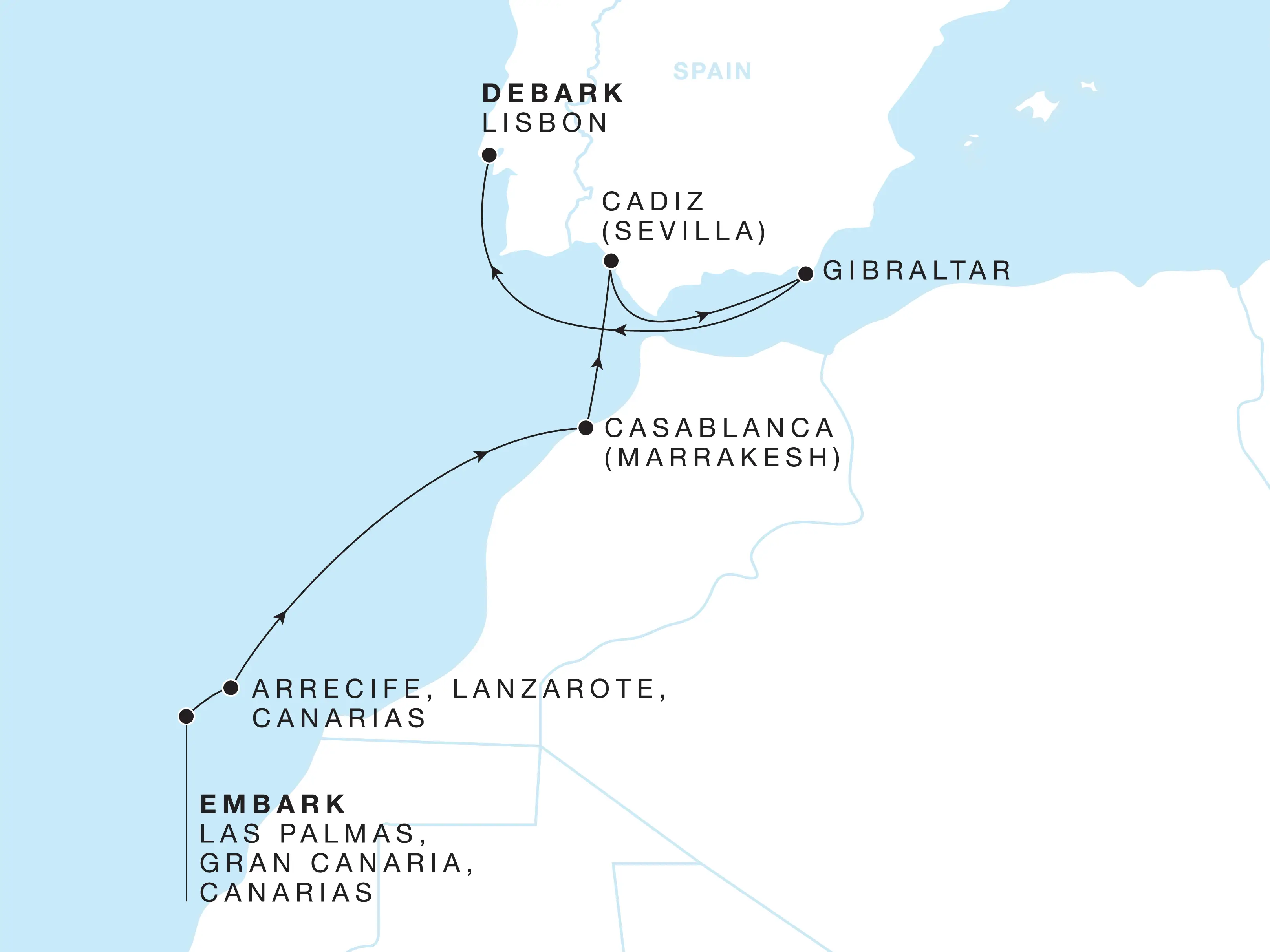 Journey through the Canary Islands, from stylish Las Palmas to the waterfront castles, serene lagoons, and art-filled enclaves that reflect Arrecife’s essence. Continue to Morocco, where Casablanca’s coastal elegance and Marrakesh’s ancient medina unveil a world of vibrant colour, rich scent, and ancient tradition. Wander lively souks, stroll amidst Moorish architecture, and feel the pulse of a city steeped in history. Two nights in Cádiz, one of Europe’s oldest continuously inhabited cities and a port favoured by Christopher Columbus, invite you to experience its historic old town and fortified sea walls. Venture inland to Seville, Spain’s spirited heart, as flamenco echoes through lively plazas and evenings unfold over Andalusian delicacies. A call in Gibraltar offers dramatic vistas between continents before your voyage concludes in Lisbon, a city of timeless charm where tiled façades and the rhythms of fado meet beneath the Iberian sun.