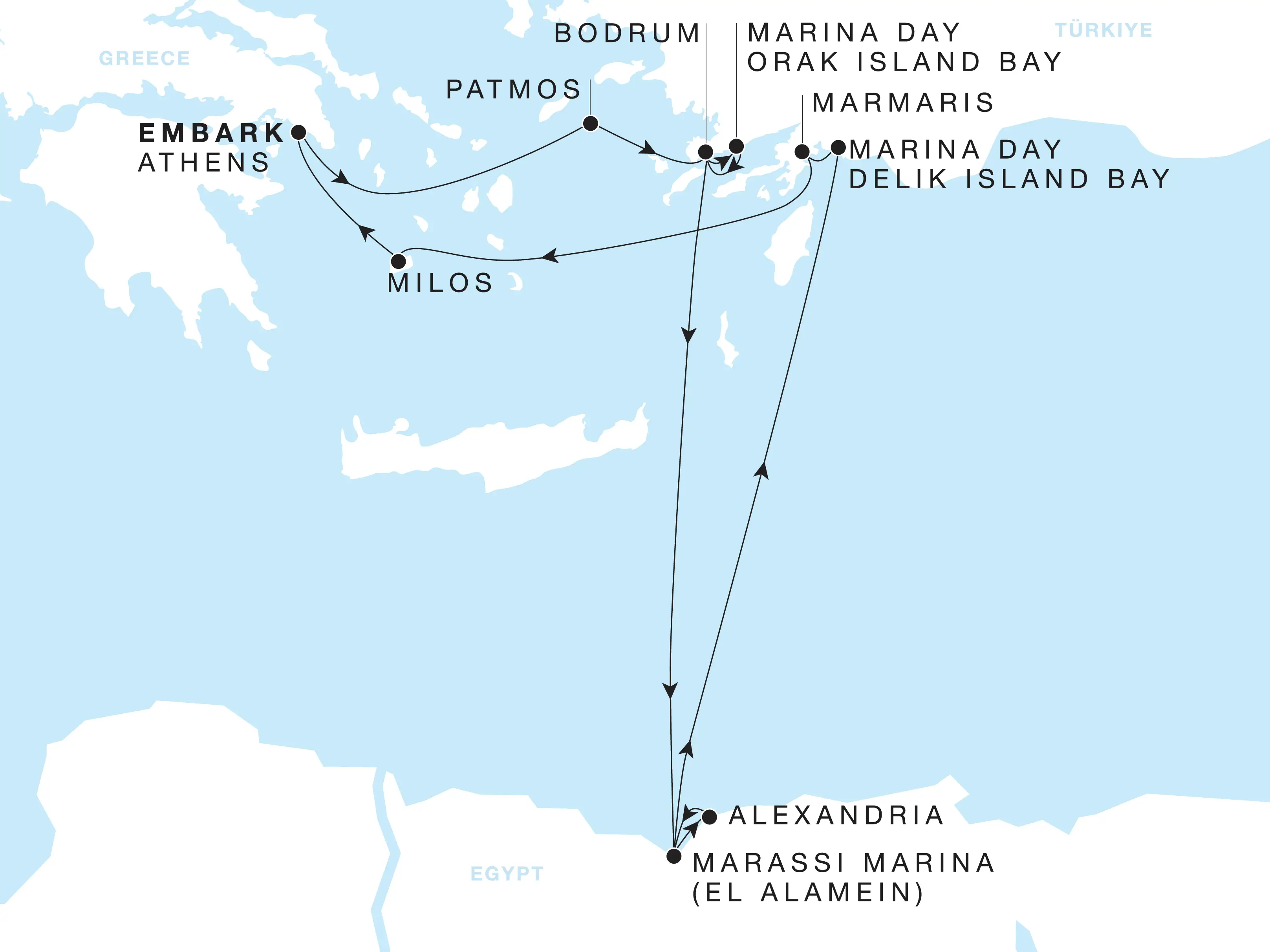 This extended voyage places Egypt at the centre of a journey linking the ancient worlds of Greece and Türkiye. Depart from Athens and sail to Patmos, where the Monastery of St. John and the Cave of the Apocalypse mark sacred ground. Swim in the mirrored waters of Orak Island Bay and stroll Bodrum’s harbour, where antiquity and modernity coexist. Cross the Mediterranean to Marassi Marina El Alamein, a coastal haven near the site of pivotal Second World War battles, before spending three days in Alexandria. There, the catacombs of Kom el Shaqafa, the Citadel of Qaitbay, and the modern Bibliotheca Alexandrina evoke its Graeco-Roman legacy. On the return north, call at Delik Island and Marmaris, then Milos, before concluding in Athens, a voyage where Egypt anchors the enduring legacy of Mediterranean civilization.