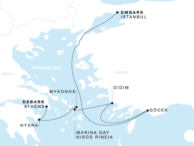 Experience the Aegean’s singular mystique on a voyage that blends ancient history, natural beauty, and unhurried charm. Begin in Istanbul, where grand palaces, soaring mosques, and colourful bazaars reflect centuries of history. Spend a day at sea before reaching Göcek, a serene Turkish retreat framed by pine-covered hills and translucent bays. In Didim, explore the magnificent Temple of Apollo and remnants of classical Greece. A relaxing Marina Day on Rineia offers emerald-hued waters and quiet coves before sailing to Mykonos, for a romantic dinner at dusk. A two-night stay in the island of blue and white allows exploration of its windmills, boutiques, and iconic Little Venice. In Hydra, car-free streets and waterfront cafés embody the slow rhythm of island life. Conclude in Athens, where ancient heritage and modern dynamism converge.