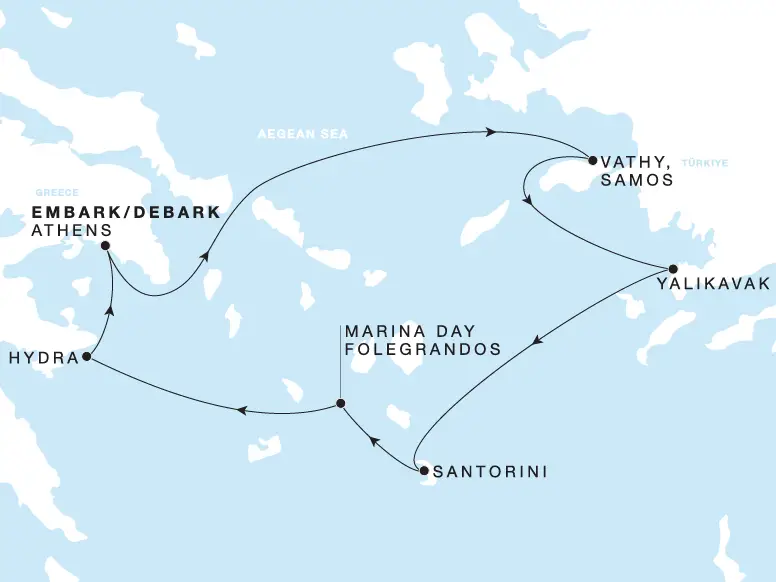From Athens, embark on a journey through some of the Aegean’s most captivating islands. Vathy, on the island of Samos, welcomes you with sweet Muscat wine, quaint fishing villages, and nearby archaeological treasures. Sail to Yalikavak, a thriving harbour framed by cobalt waters, then on to Folegandros, where quiet anchorages and rugged cliffs create a haven of calm. Santorini enchants with its sweeping caldera views, whitewashed villages, and famed sunsets, while Hydra’s cobblestone lanes, neoclassical mansions, and a bustling harbour capture the soul of the Greek islands. Returning to Athens, this journey weaves together culture, history, and coastal splendour for an unforgettable Aegean experience.