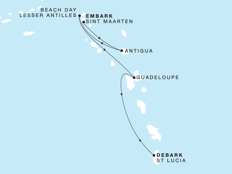 Embark in the cosmopolitan harbour of Philipsburg, setting course for the island of Antigua. In Falmouth, centuries of yachting tradition meet refined dining and lively evenings. Spend a full day and evening exploring UNESCO-awarded Nelson’s Dockyard, the stylish and iconic Yacht Club, and colourful colonial architecture. A sun-washed interlude awaits with a Beach Day in the Lesser Antilles, followed by extended time in Guadeloupe. Brimming with Creole character and history, Terre-de-Haute features a UNESCO-listed bay of exceptional beauty. Indulge in a spa treatment or lounge on the yacht during a leisurely day at sea before concluding your voyage in Castries, St. Lucia.