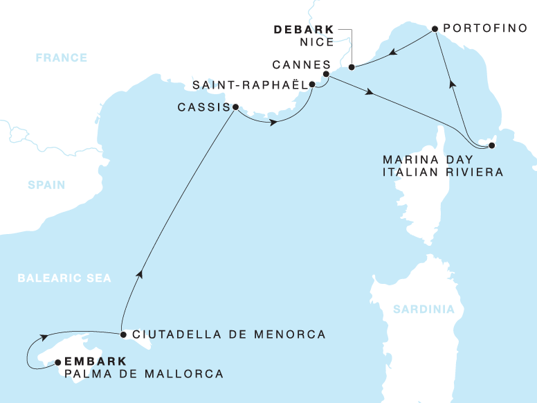 Sail from Palma de Mallorca toward the dramatic landscapes of Menorca, the golden cliffs of Cassis, and the chic coastal elegance of Saint-Raphael. Linger overnight in dazzling Cannes before setting out toward the pastel harbours of Portofino and a blissful marina day along the Italian Riviera. At the end of your voyage, Nice welcomes you with palm-lined promenades, charming cafés, and sun-kissed beaches.