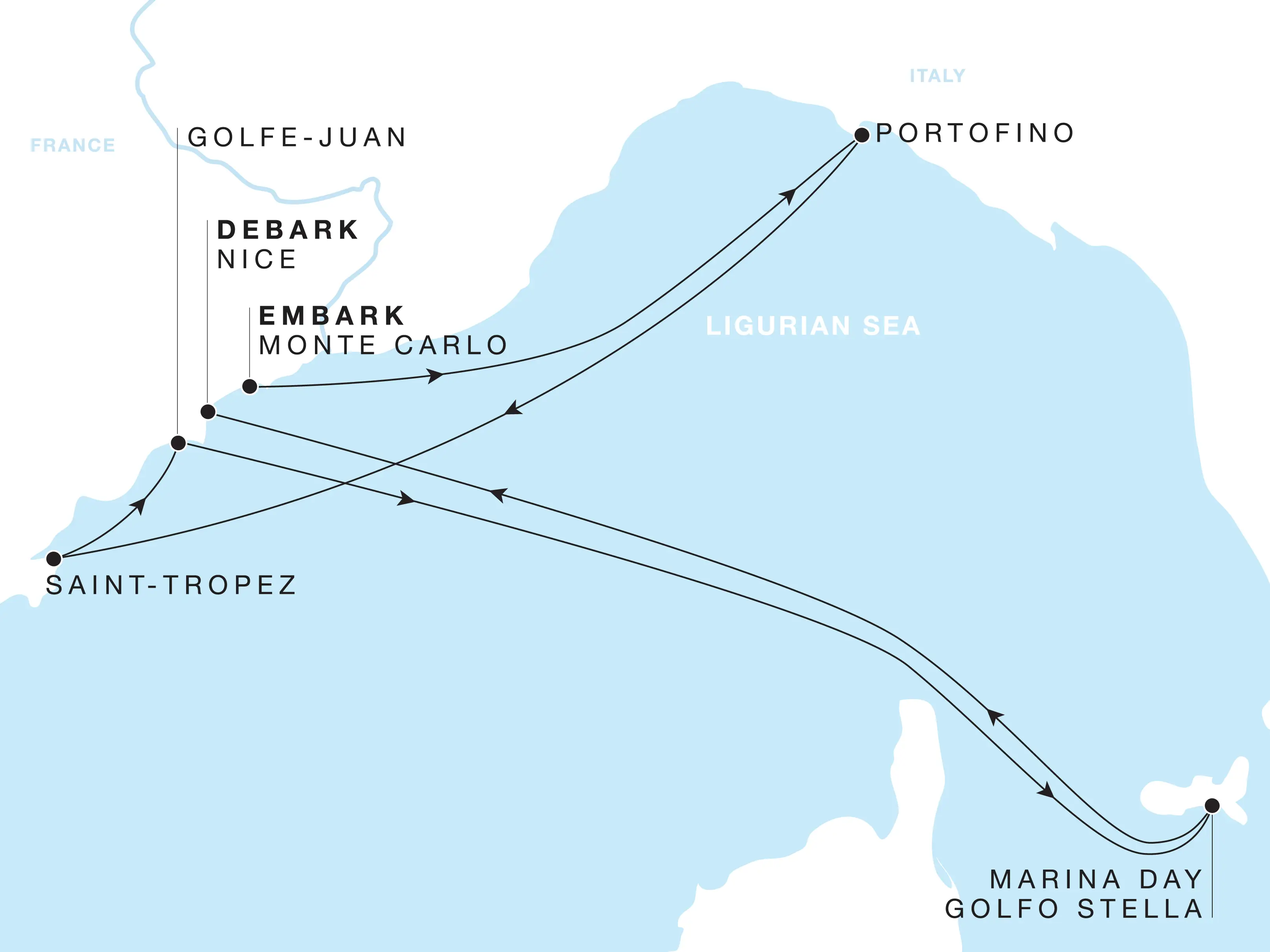 Begin in Monte Carlo, a sophisticated playground of glittering casinos and yacht-filled marinas that sets a celebratory tone for the journey ahead. Sail to Portofino, where its picturesque harbour and pastel buildings reflect the timeless elegance of the Italian Riviera. Spend a night in Saint-Tropez, embracing its casual-chic allure and the irresistible treasures of old town. Continue to Golfe-Juan, a discreet Riviera haven of golden sands and elegant villas, where Napoleon returned from exile. A Marina Day in the serene, translucent waters of Golfo Stella, invites both relaxation and water sport recreation. Conclude in Nice, taking in its artistic penchant and vibrant energy for a fitting finale to your Riviera experience.