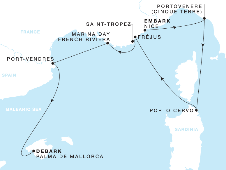 From picturesque Nice, set out toward Sardinia’s unspoiled shores and the colourful, cliffside villages of Cinque Terre. Follow the coastline to Fréjus, then immerse yourself in the glittering atmosphere of Saint-Tropez during an overnight stay. A tranquil marina day and a stop in Port-Vendres offer the perfect opportunity to bask in the beauty of the French Riviera before concluding your journey in Palma de Mallorca.