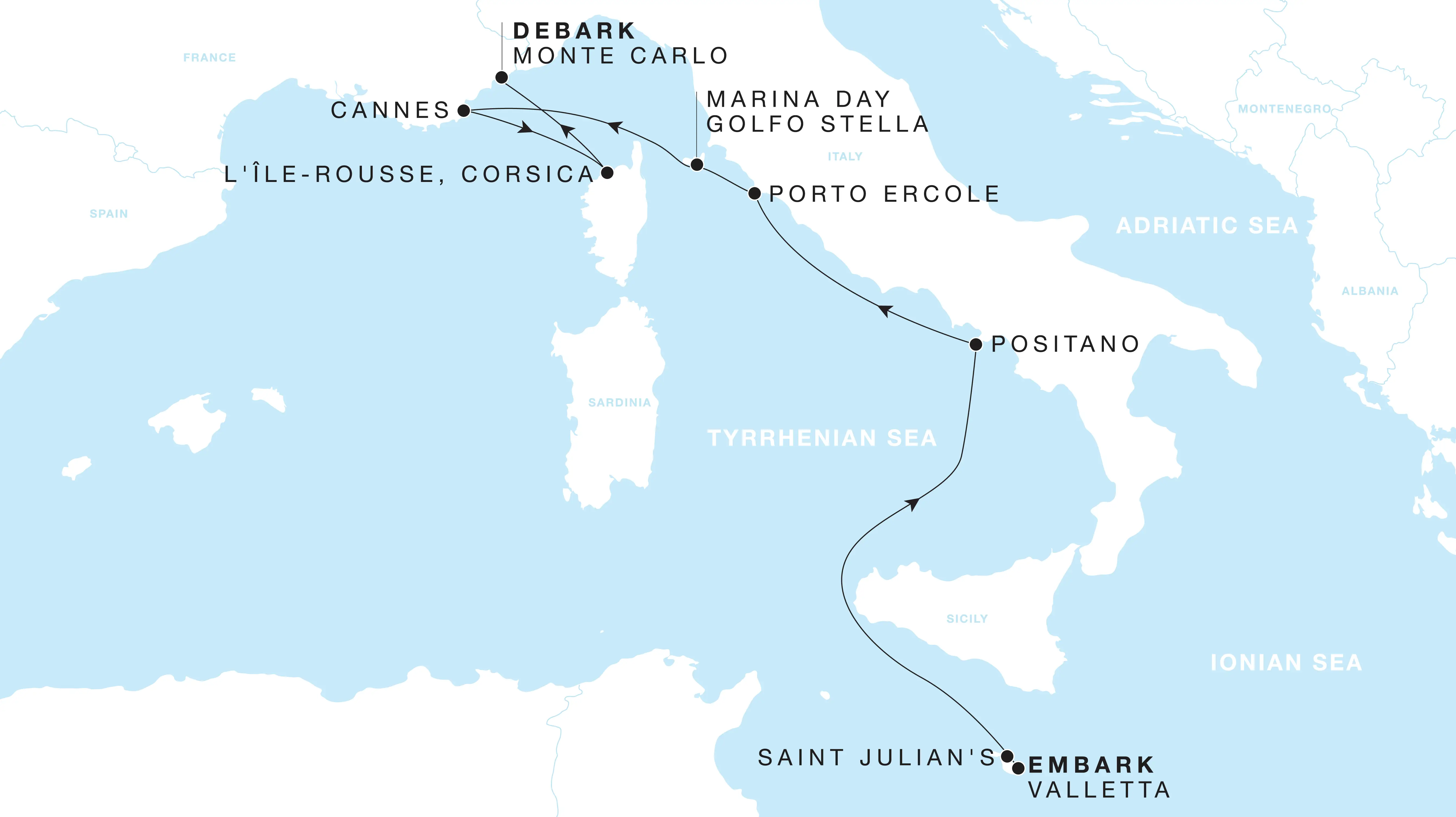 Depart from the storied port of Valletta and embark on a journey along the Mediterranean’s most captivating shores. In Malta, linger at St. Julian’s café terraces before sailing to Positano, where pastel houses spill down limestone cliffs toward the sea. Explore Porto Ercole, a tranquil enclave on the Argentario coast, and drop anchor in Golfo Stella for a Marina Day framed by emerald hills and crystalline waters. In Cannes, browse the designer boutiques of the rue d’Antibes, sip a Kir Royale al fresco, and soak in Provençal savoir faire. Continue to L’Île-Rousse, at the foot of Corsica’s Balagne hills, a sheltered haven of rugged beauty and island charm. Conclude in Monte Carlo, the Riviera’s glittering jewel of elegance and culture.