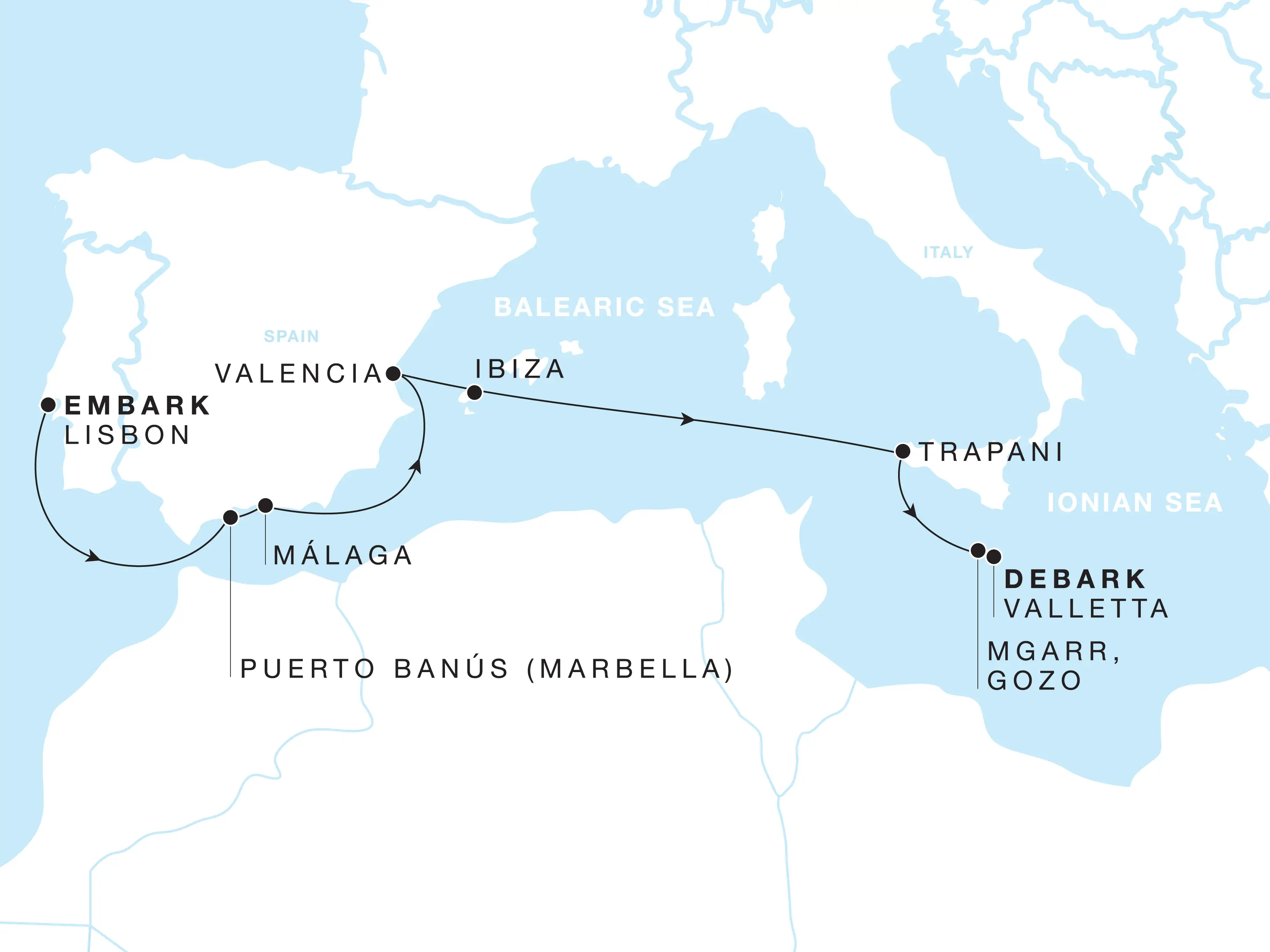 Set sail from Lisbon, Portugal’s capital of light and life, and cross into the Mediterranean on a voyage that pairs coastal beauty with cultural depth. Glide past the Rock of Gibraltar toward the glittering shores of Puerto Banús, followed by a pilgrimage to Málaga, birthplace of Picasso and gateway to Andalusian charm. After a relaxing day at sea and a visit to forward-thinking Valencia, indulge in authentic Neapolitan fare and explore Trapani, the “City of Salt and Sail,” where weathered churches stand as a testament to its storied past. Continue to Mġarr, a serene glimpse into the rustic heart of the Maltese archipelago, before concluding in Valletta, Malta’s striking walled capital.